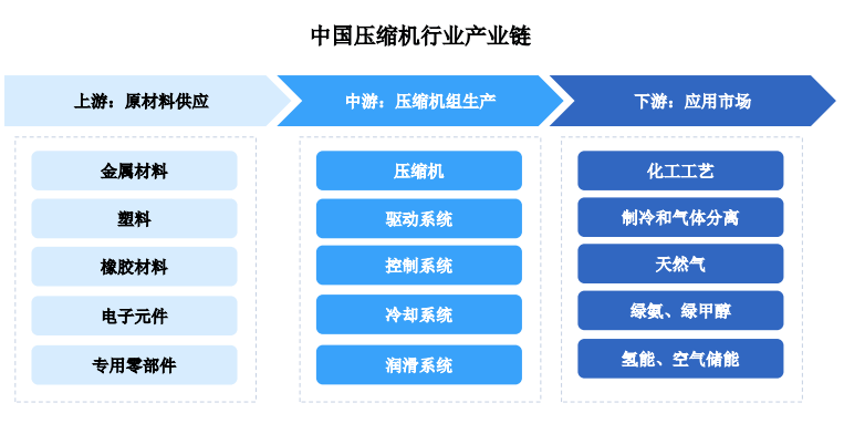 压缩机行业的上游主要涉及原材料与配套件供应。原材料主要包括金属材料、塑料和橡胶材料、电子元件、润滑油和冷媒等,其中,金属材料是压缩机制造的重要组成部分,主要包括铸铁、铝合金、不锈钢等,用于制造压缩机的外壳、气缸、转子等关键部件;塑料和橡胶材料主要用于制造压缩机中的密封件、垫片、管道等;电子元件主要应用于传感器、控制器、变频器等,以提高压缩机的运行效率。原材料的价格波动和质量直接影响到压缩机的生产成本和市场竞争力。因此,压缩机企业需密切关注原材料价格走势,优化采购策略以降低成本。